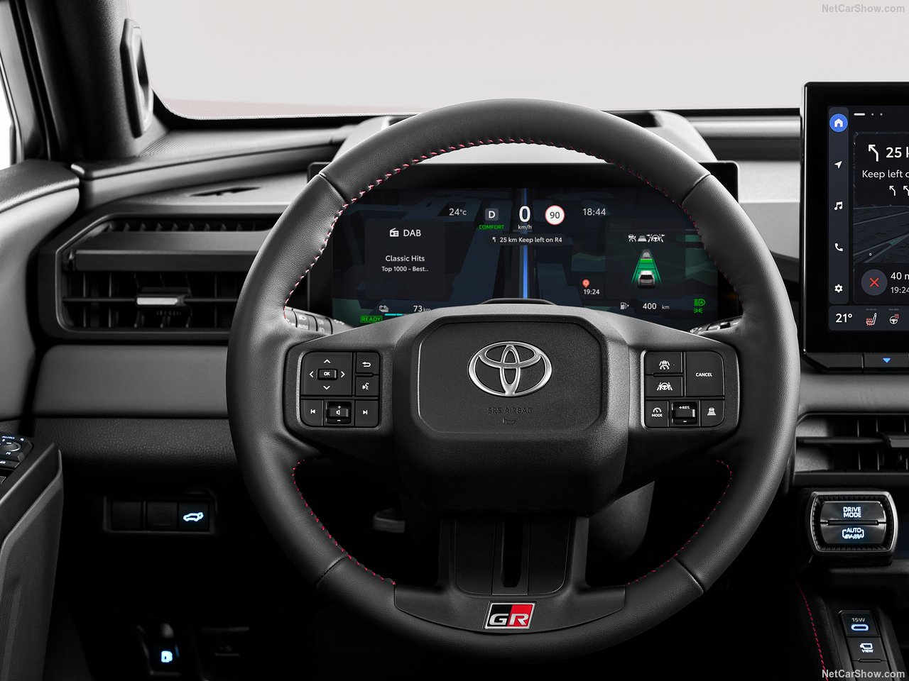 車內的話首先可以看到GR Sport的方向盤,雙前跑車座椅,除了有紅色滾邊,還有真皮+麂皮的雙材質來混搭,前座在大腿靠近中央馬鞍部位的側邊,