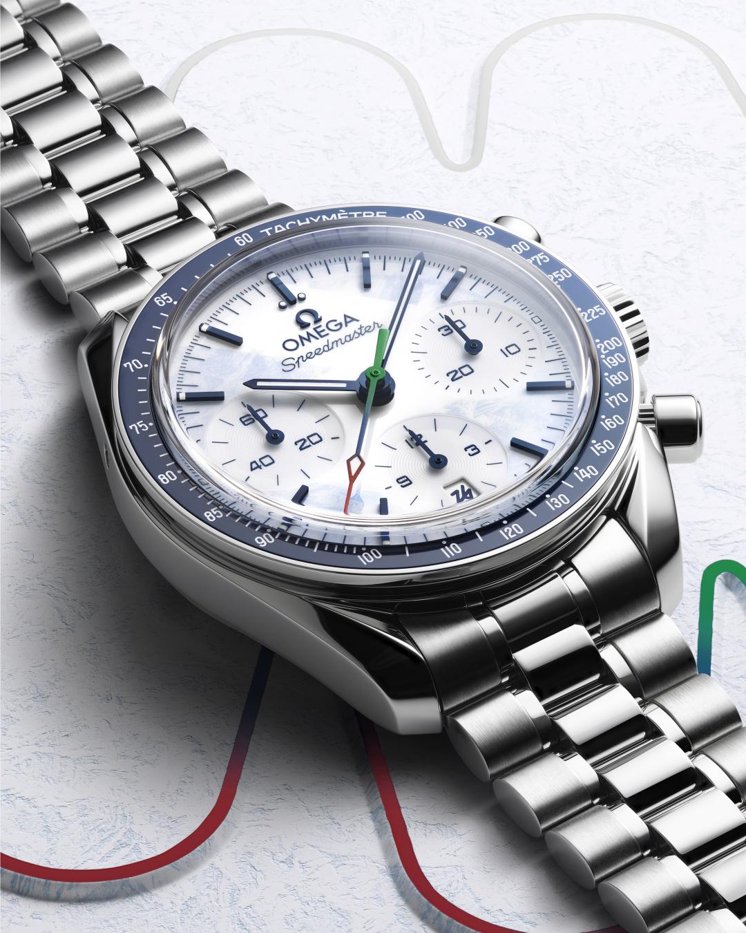 並以純白琺瑯填充測速刻度,藍白配色呼應冬季奧運的獨特雪景和活力;白色亮漆錶盤覆以淡藍冰霜質感塗層,