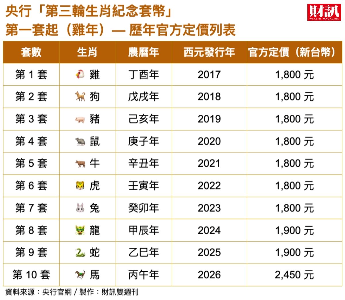 第三輪生肖紀念套幣自2017年雞年至2023年兔年,定價長期維持在1800元,在2024年龍年首度上調至1900元,而今年馬年再度明顯調升,