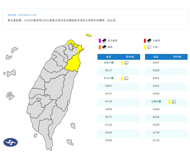 東北風影響,今晚至明日基隆北海岸及宜蘭地區有局部大雨發生的機率,請注意。