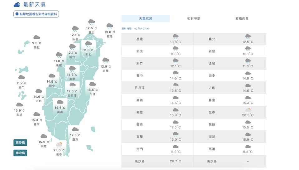 低溫預測為西半部、宜蘭、花蓮10~13度,台東15~16度;