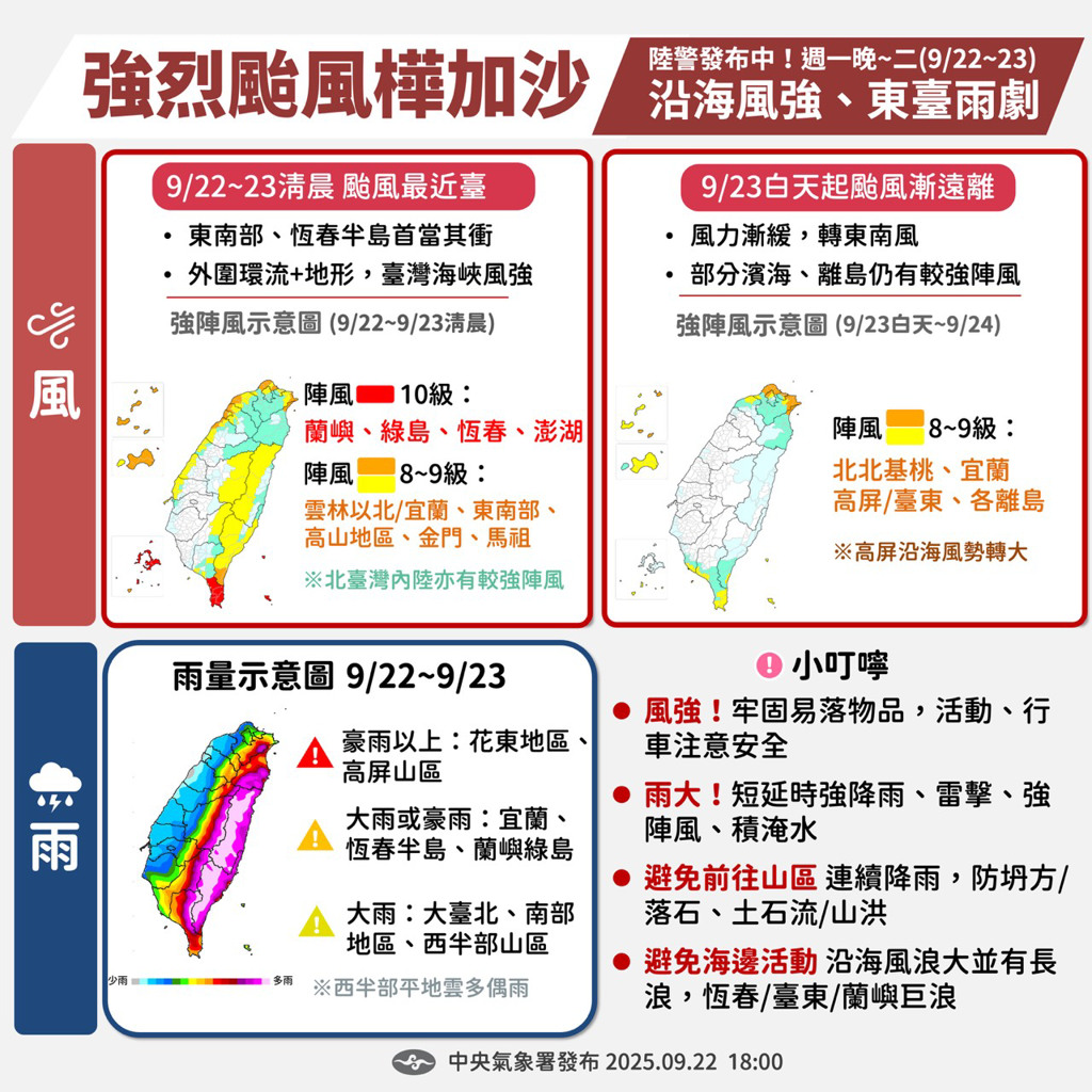 風力部分,雲林以北、高屏、東半部地區沿海及各地山區易有平均風6級以上或陣風8級以上,蘭嶼、綠島、澎湖有平均風9級以上或陣風11級以上,