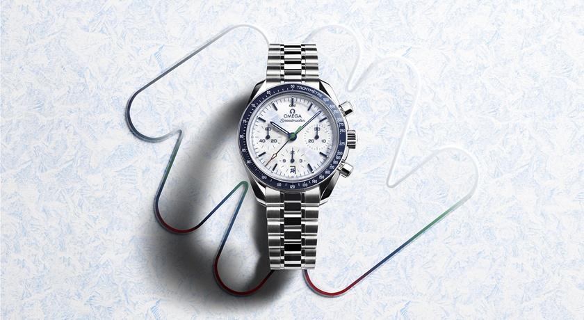 並以純白琺瑯填充測速刻度,藍白配色呼應冬季奧運的獨特雪景和活力;白色亮漆錶盤覆以淡藍冰霜質感塗層,