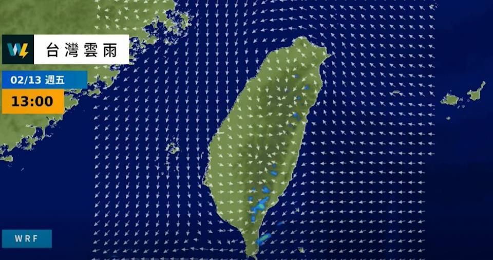 將近春節期間方面,天氣風險師林孝儒說明,13日(週五)至15日小年夜(週日)台灣附近為高壓迴流偏東或南風環境,